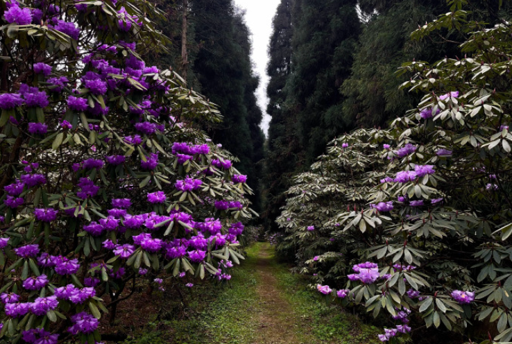 龙池的杜鹃已然次第开放。有些品种已经怒放。有些品种此时不是盛放的那种闹,是刚刚醒来的那种羞。粉粉的、紫紫的、还有些是雪白的,都含着露水,在斜阳里闪着细细的光。花苞儿还多着,鼓鼓的,尖尖的,像无数支蘸饱了胭脂的笔,对着天在那里描啊描的。有些急性子的,已经全树绽放,花瓣儿薄得透明,能看见光从背面透过来,把那粉色晕染得越发柔了。山风过处,满树的花骨朵轻轻颤着,仿佛都在屏着气息,等待一个什么约定的时刻。