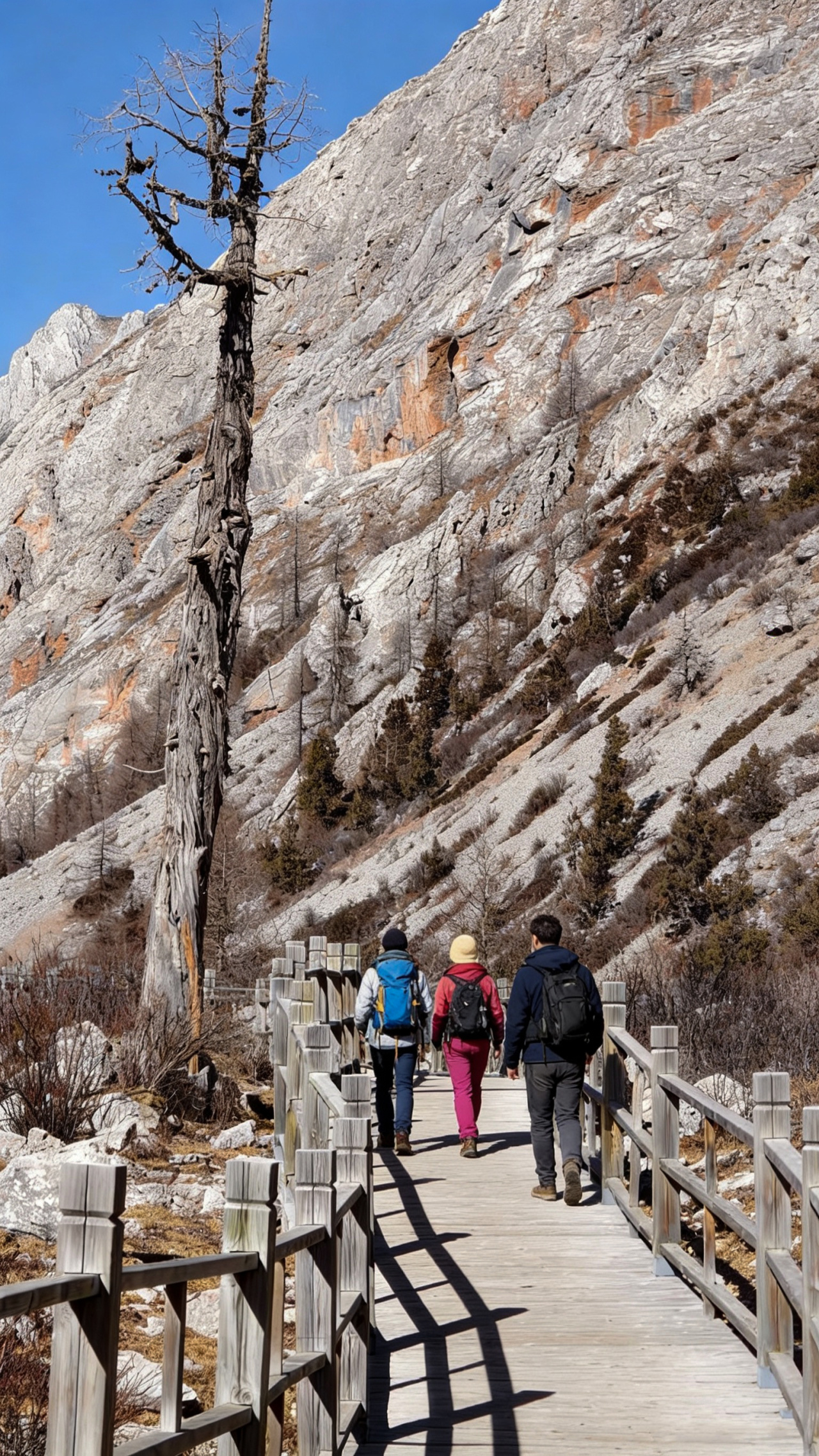 【今日行程】早晨起床退房,乘车出发。然后换乘坐当地中转车约30分钟后到达徒步起点。前段约2公里为栈道,比较好走。紧接着是1.5公里碎石坡爬升,请提前备好冰爪,手套,帽儿等防寒物品。下午预计13点左右人齐后大巴返程回成都。